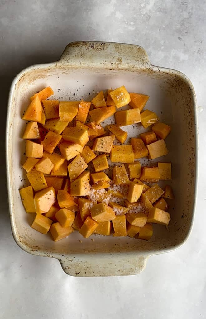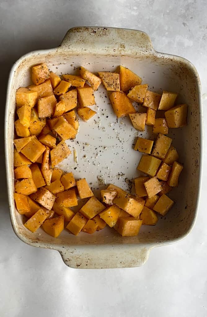 - Peel, de-seed, and chop your butternut squash into even, small cubes. Add the butternut squash to a baking dish and drizzle over the olive oil and seasonings, stirring to ensure the cubes are fully coated.