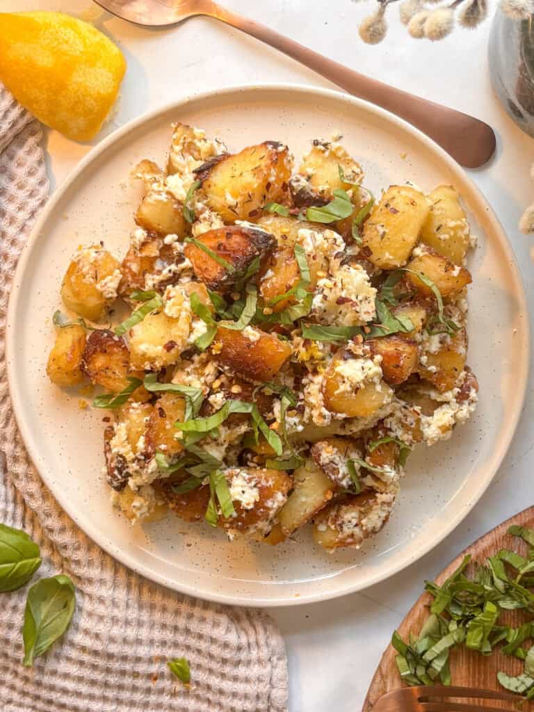 Use the back of your wooden spoon to mash the baked feta, and add the mashed garlic and fresh basil. Gently toss the potatoes with the baked feta and garlic mixture. Finish with more chopped fresh basil and a squeeze of lemon juice, and serve with your choice of sides!
