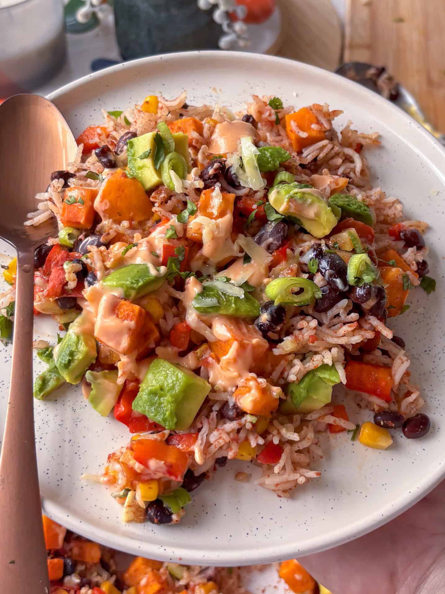 What I love about this recipe is how little effort it takes for how much flavor you get out. There's no sautéing, no pre-cooking the rice - you just tip everything into a casserole dish, cover with foil, and let the oven do all the work. Sweet potato, bell peppers, zucchini, and sweetcorn bulk it out with veg, while the smoked paprika, cumin, and cayenne give it that warm, smoky Tex-Mex flavor.