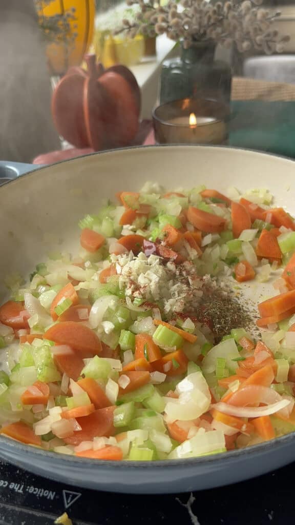 Start by softening the onion, carrot, celery, and chili in olive oil, creating the flavor base for the soup.