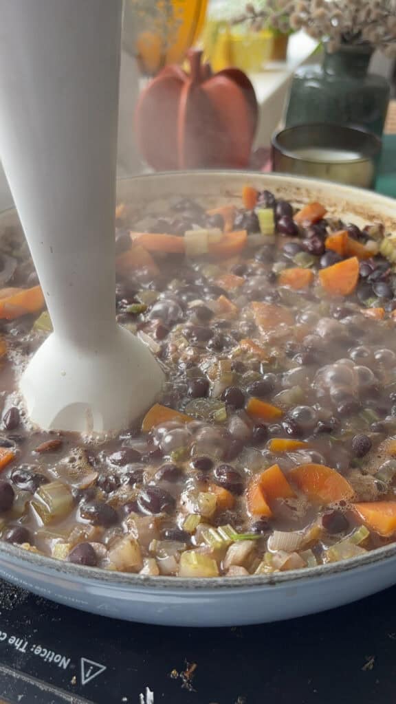 - Use a stick blender to blend about ⅓ - ½ of the pot until you get your desired creamy texture with chunks of vegetable and black beans still in the pot.