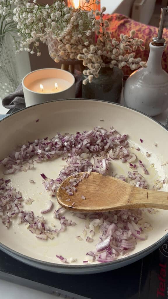 - Heat oil on a large pan, then add the onion and carrot and saute for 5-7 minutes, before adding the minced garlic and cooking for another minute or two.