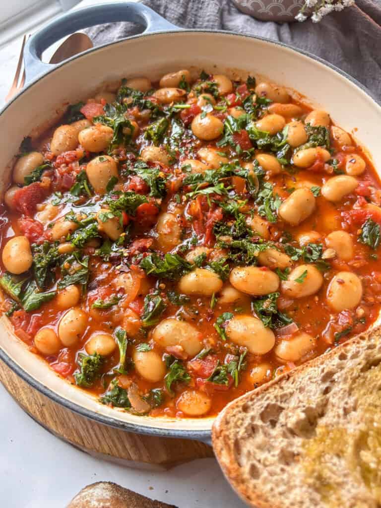 I love serving a bean stew with a side of crusty sour dough to mop up the sauce! To make this recipe vegan, simply omit the hard cheese.