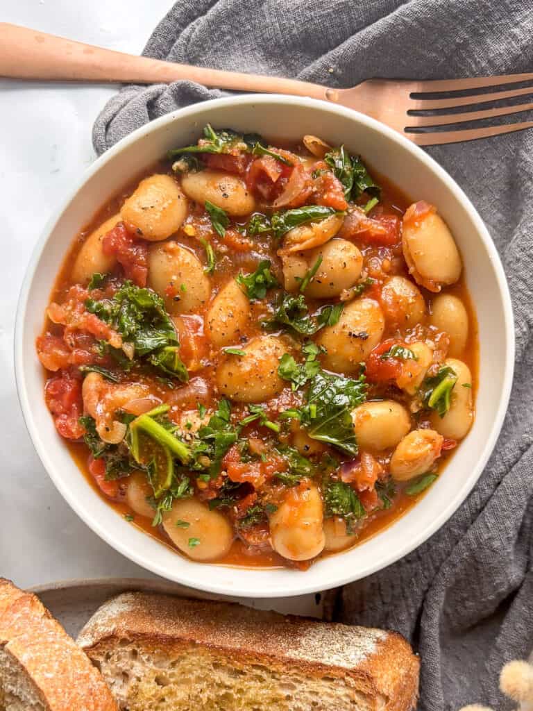 I love serving a bean stew with a side of crusty sour dough to mop up the sauce! To make this recipe vegan, simply omit the hard cheese.