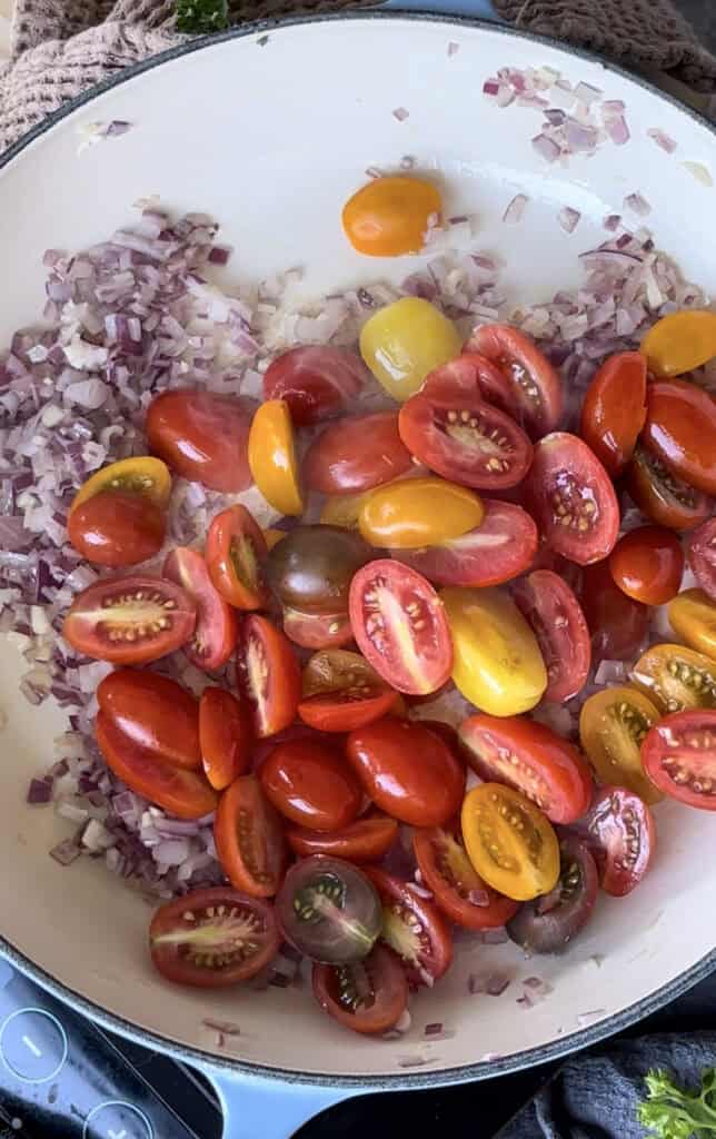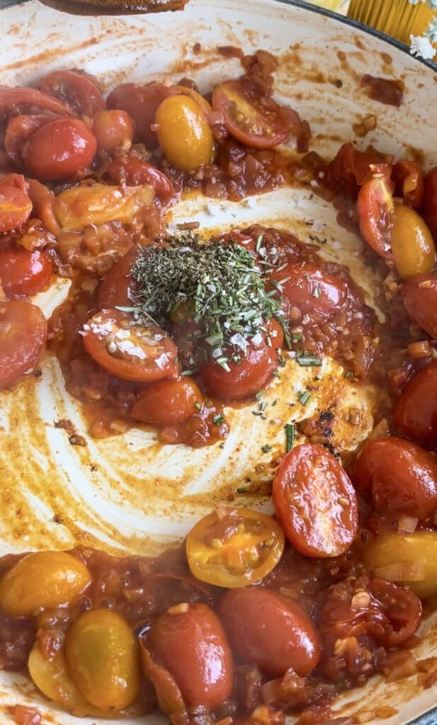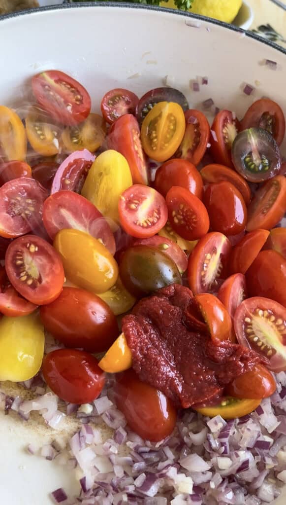 Add your halved cherry tomatoes, the tomato paste, and some water to the pan. Cover and cook for several minutes until the tomatoes have begun to break down.