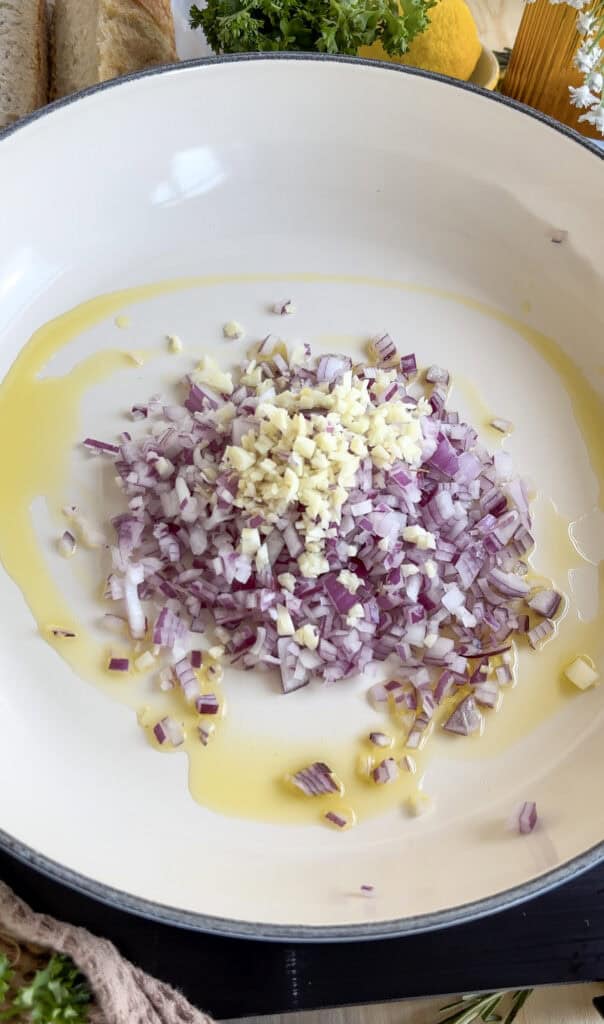 - Heat oil on a large pan, then add the onion and saute for 5-7 minutes, before adding the minced garlic and cooking for another minute or two.