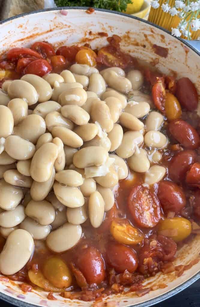 - Mixed Cherry Tomatoes: Mixed cherry tomatoes make up the rich tomato sauce that pairs perfectly with the butterbeans. I used "tawny" cherry tomatoes which come in a box with red, yellow, and orange cherry tomatoes. If you can't find mixed colors, normal red cherry tomatoes will also work. You just need to gently break up the tomatoes with the back of your spoon. You could also use tinned chopped tomatoes instead.