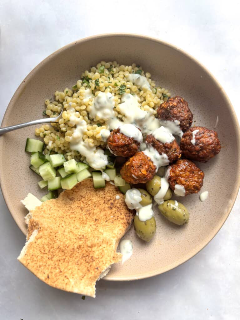 Harissa Meatballs with Whipped Feta and Herby Pearl Couscous