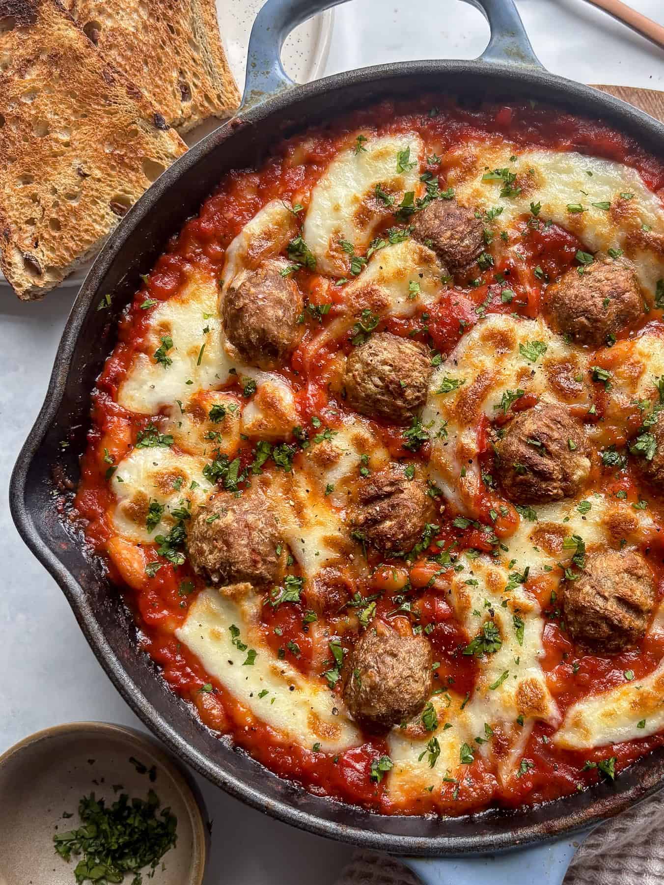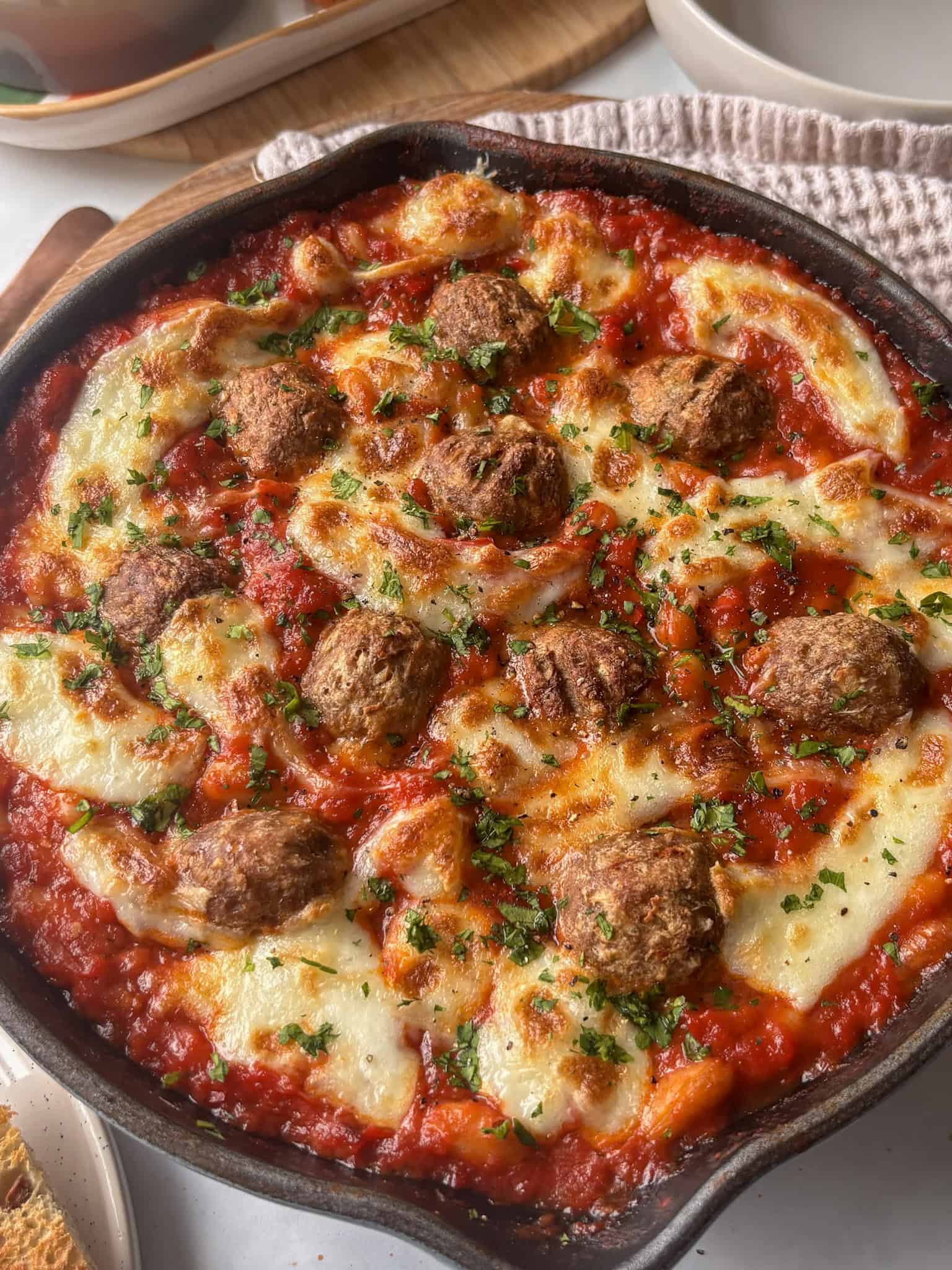 These cheesy baked meatballs are a one-pan dinner that's cozy, satisfying, and ridiculously easy. Vegetarian meatballs are nestled into a spiced tomato and cannellini bean sauce for a meal that's rich in fiber and protein, all topped with fresh mozzarella and baked until golden and bubbling. Serve with crusty bread for mopping up the sauce, and you've got the perfect weeknight comfort food.