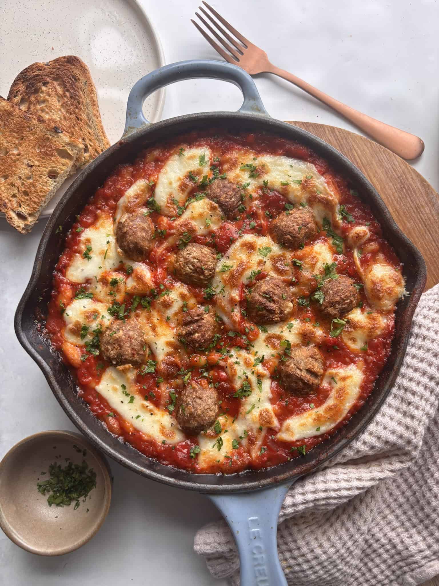 These cheesy baked meatballs are a one-pan dinner that's cozy, satisfying, and ridiculously easy. Vegetarian meatballs are nestled into a spiced tomato and cannellini bean sauce for a meal that's rich in fiber and protein, all topped with fresh mozzarella and baked until golden and bubbling. Serve with crusty bread for mopping up the sauce, and you've got the perfect weeknight comfort food.