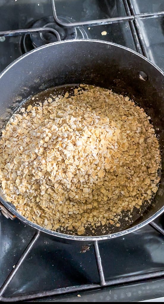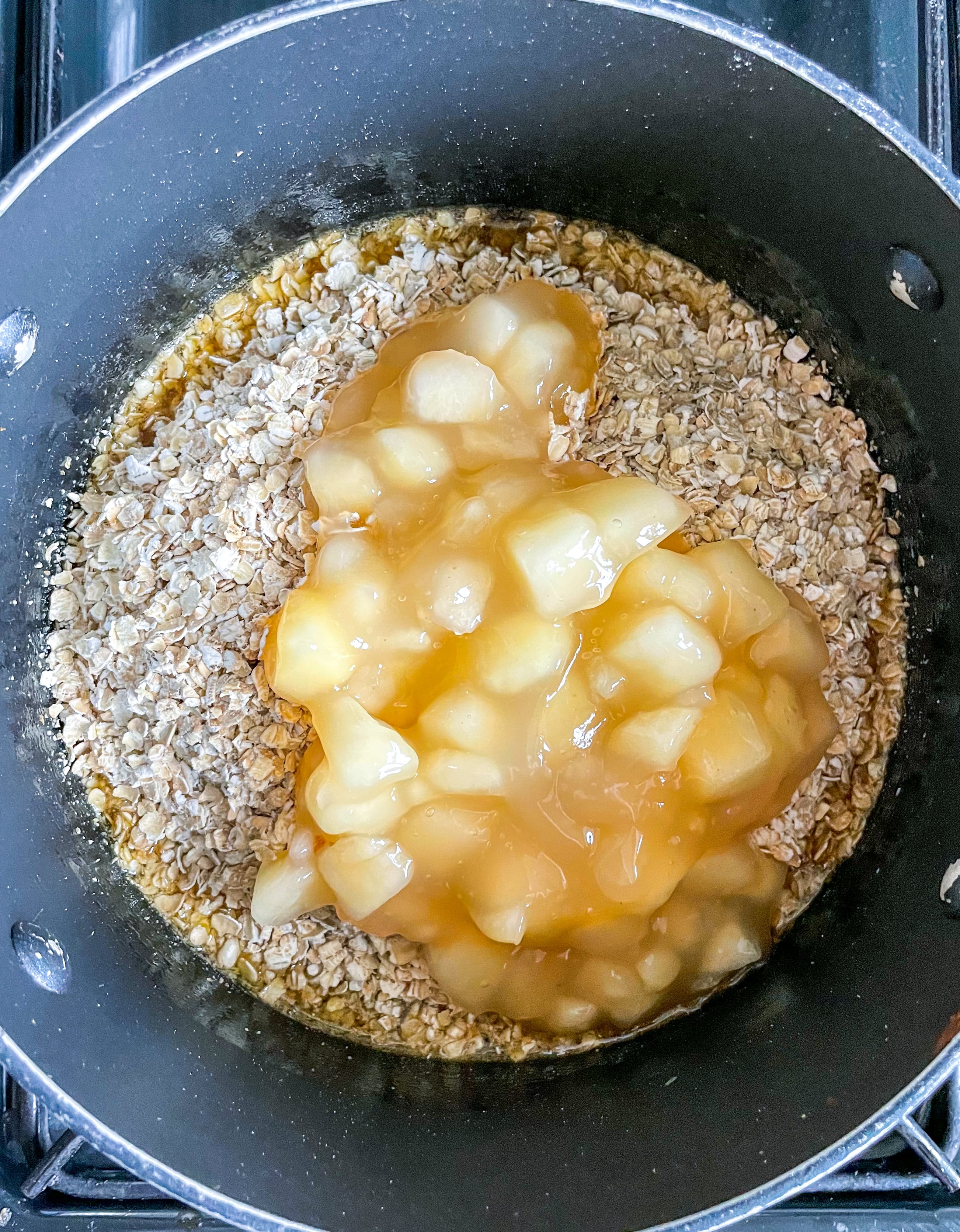Add the apple filling or apple sauce, oats, and cinnamon to the saucepan with the melted butter mixture and stir to combine. Make sure all the ingredients are well mixed so that the oats are evenly coated.