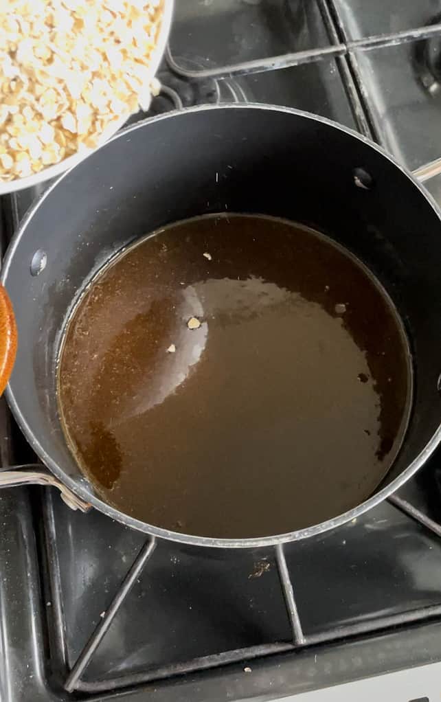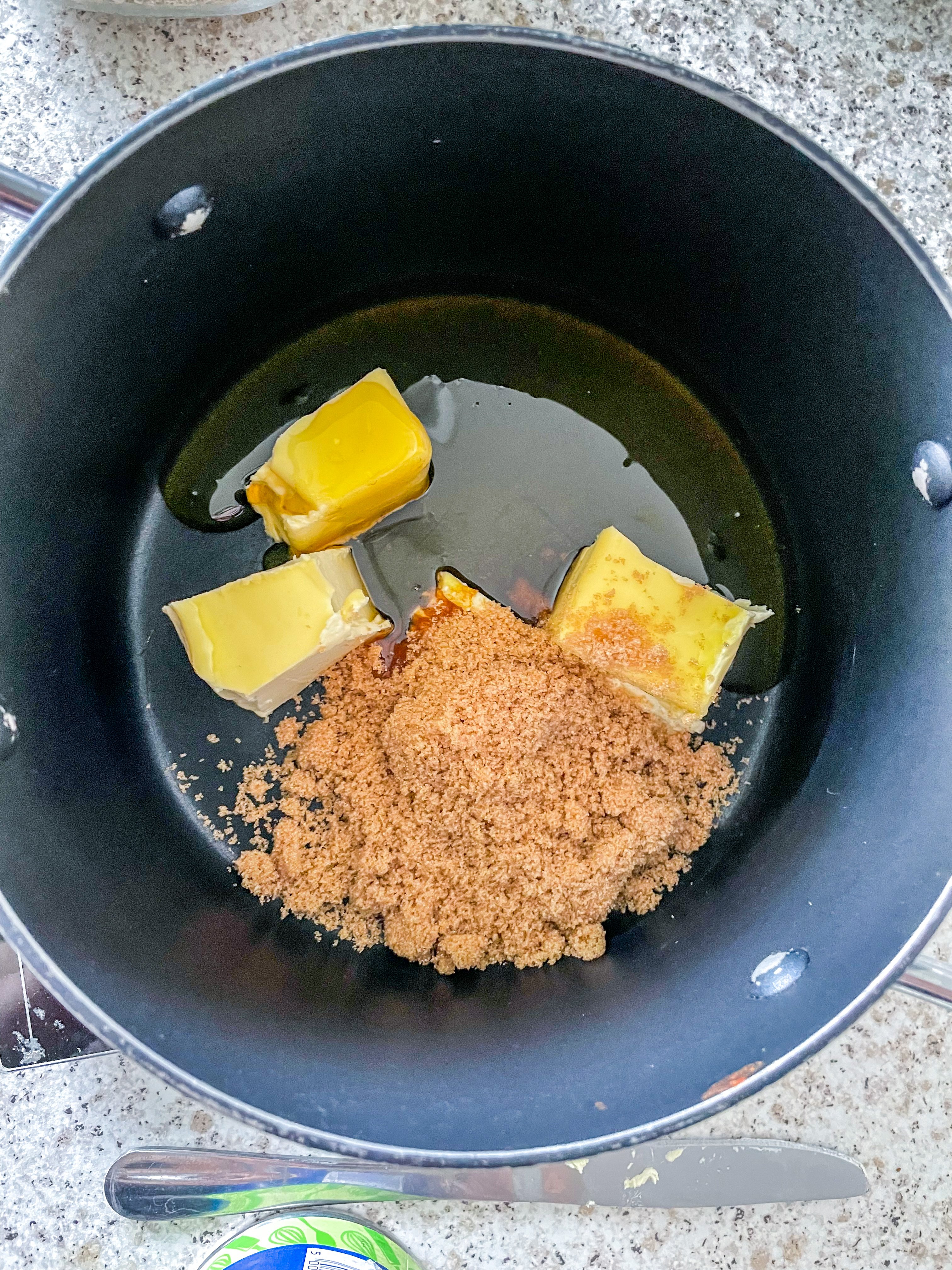 - Add the butter, golden syrup, and brown sugar to a saucepan and heat on low until the butter has melted.