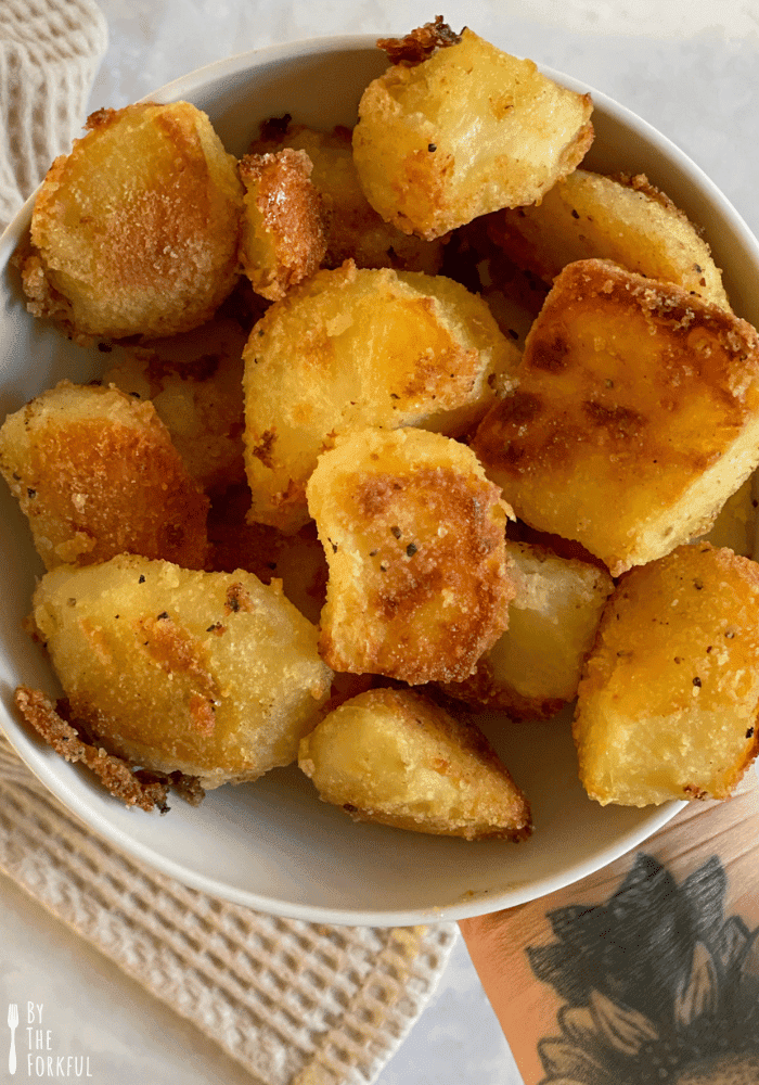 Fluffing up the potatoes after par-boiling and adding the par-boiled potatoes to a hot pan with hot oil are two key parts of getting perfectly crispy potatoes, so don't skip these! Keep in mind that the bigger your potatoes are cut, the longer they may take to roast (equally, if you like small roasties then your cooking time may be less!).