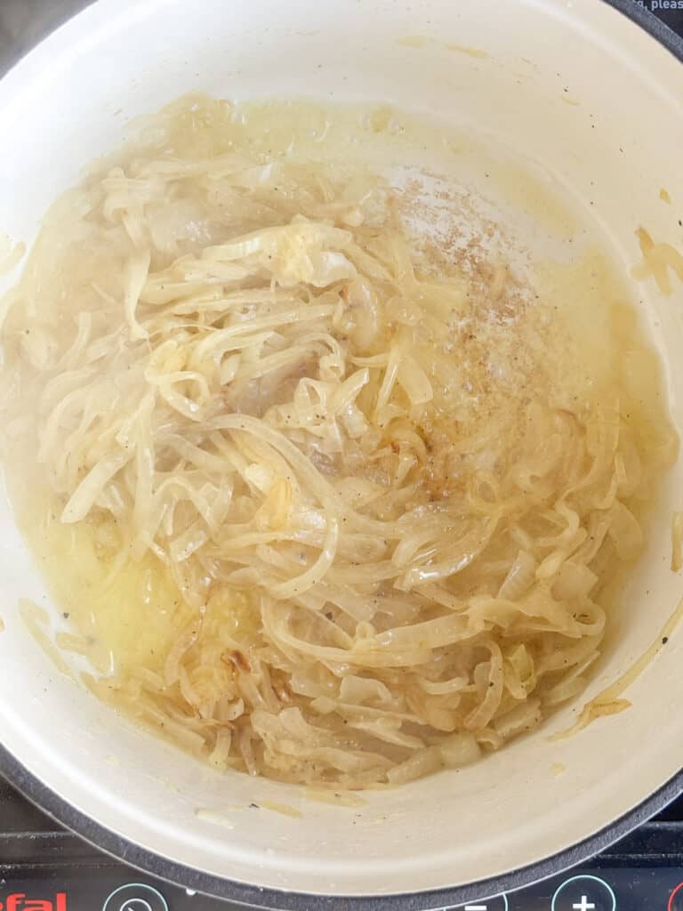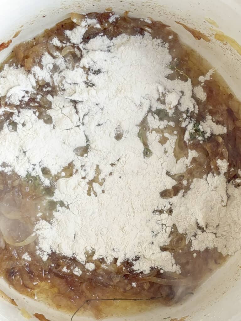 - Add the flour and stir into the onions, then add the white wine and deglaze the pan, cooking for another 5-8 minutes until the white wine has cooked down.