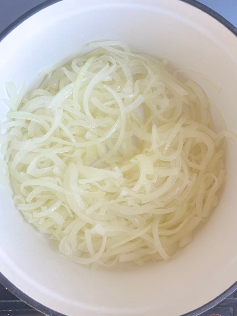 Start by thinly slicing your white onion. I cut the stem off the onion, then cut it in half from the root (so cutting the root exactly in half) and peel the skin away. Then, place the flat section down on your chopping board, and thinly slice the onion crosswise (as opposed to from stem to root).