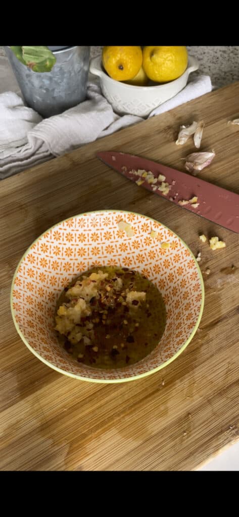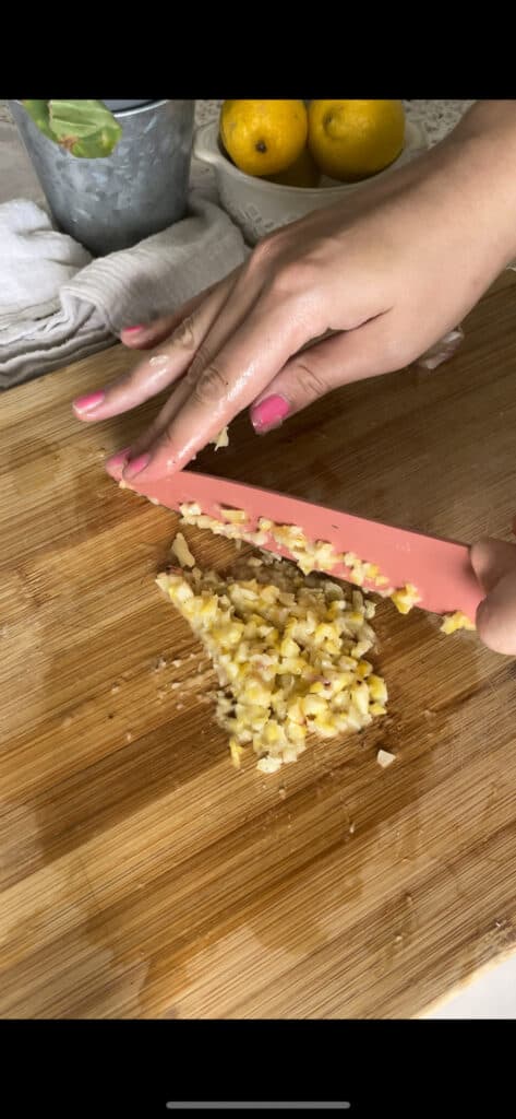 - Squeeze the garlic out of their skins (this should be very easy!) and then finely dice the lemon (including the rind) and garlic into almost a paste.