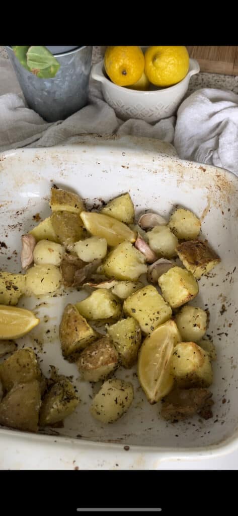 - Nestle your quartered lemon and garlic cloves (unpeeled) into the potatoes and pop in the oven for 20 minutes.
