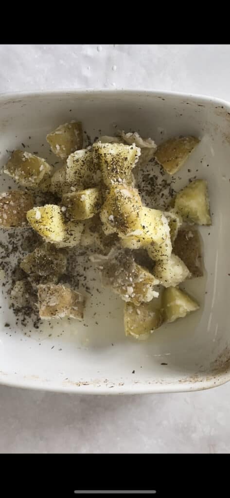 For this recipe, I parboiled the potatoes for about 10 minutes until just about soft and tender. After draining them, I put a lid over the pan and gave them a really good shake.