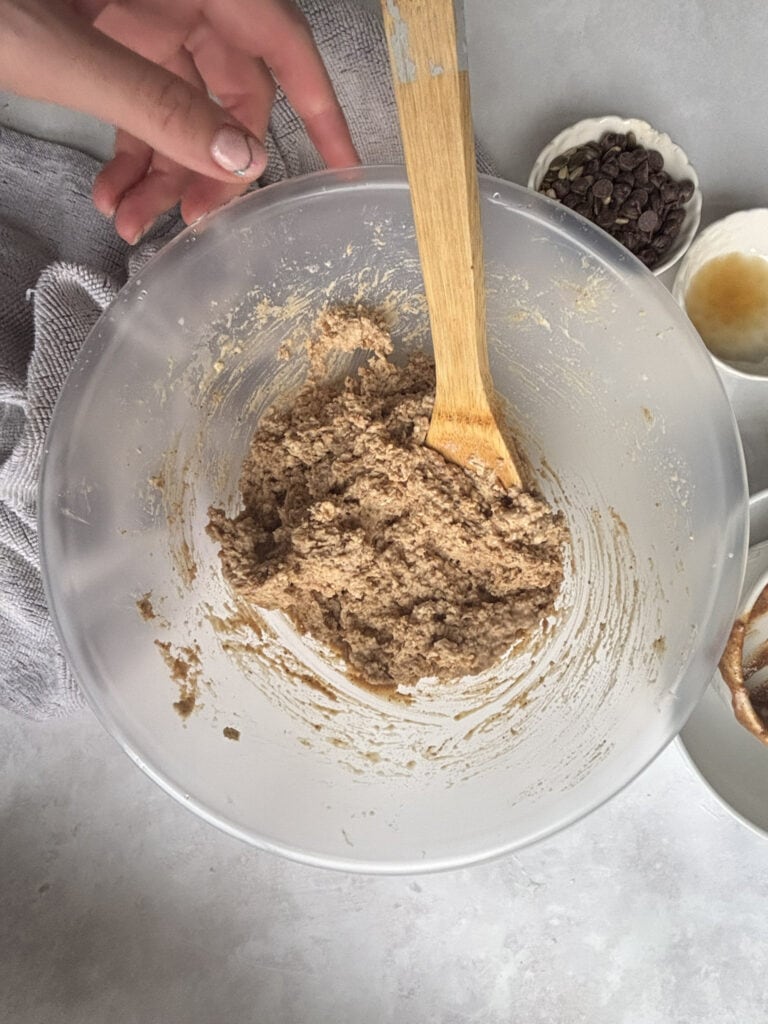 - Add the peanut butter, maple syrup, vanilla essence, and plant-based milk. Combine everything and ensure there are no dry sections left in the mixture.