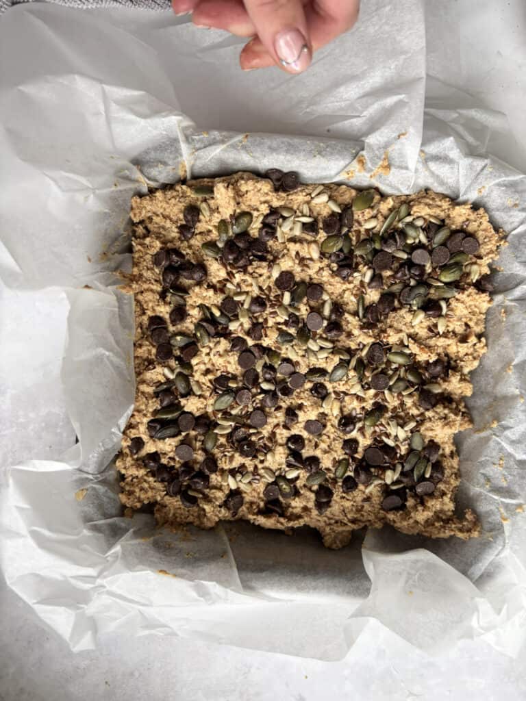 - Scatter over the chocolate chips and seed mix, pressing them slightly into the flapjack mixture.