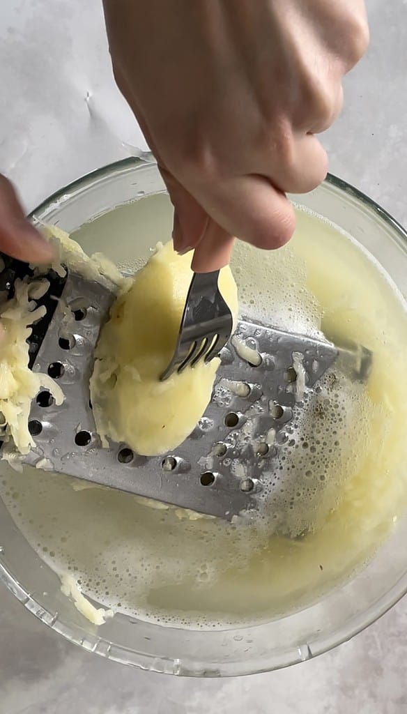 - Hold a box grater over the bowl of water and grate the potatoes into the water. Use a fork when the potato gets difficult to hold!