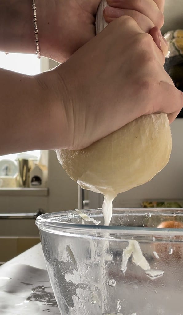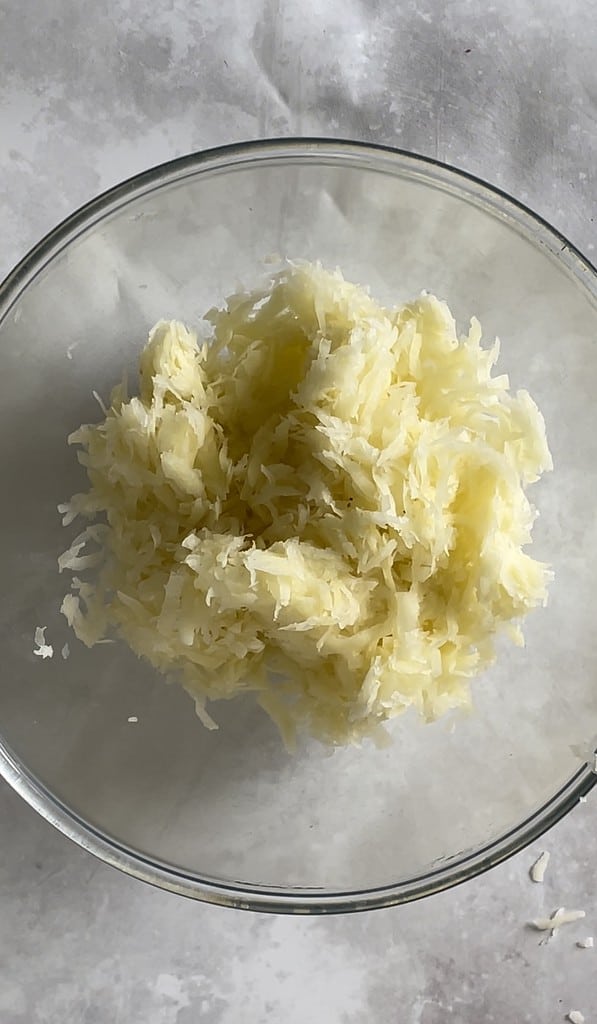 - Leave the grated potatoes to soak in the water for about 30 minutes (minimum), then place the potato shreds in a muslin cloth or cheesecloth and strain all the water out - as much as you can!