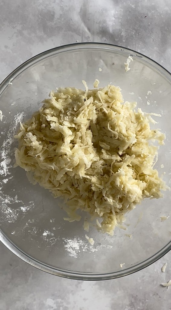 - Tip the dry potato shreds into a large mixing bowl and add the flour, vegetable oil, and seasoning. Stir to combine. It should lightly stick together into a ball.