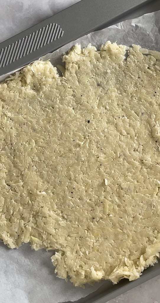 - Line a baking tray with baking paper, and then tip the hash brown mix onto the paper. Cover with a second piece of paper and then use a rolling pin to roll the potato mix flat, about 0.5 cm thick.