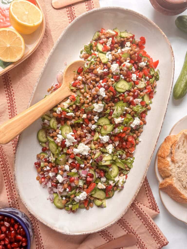 This fresh and easy lentil salad is healthy, hearty, and perfect for a satisfying lunch or side dish. Packed with protein-rich lentils, sweet pomegranate seeds, crunchy cucumber, and creamy feta, it's a great way to get plenty of texture and flavor in one bowl and can be meal prepped for lunches for the week! Tossed with a punchy red wine vinaigrette, this dish is simple to pull together and holds up well in the fridge for easy meal prep.