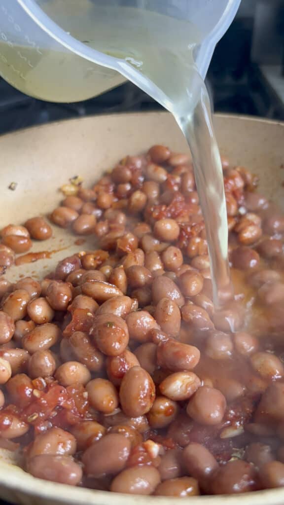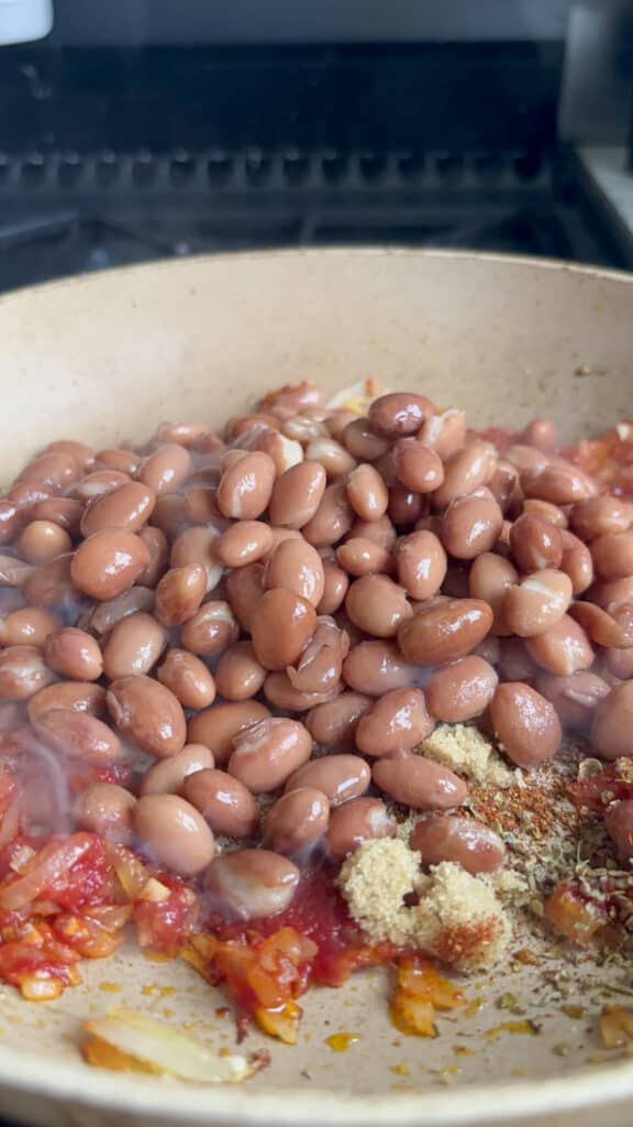 Tip the drained pinto beans into the pan followed by your vegetable stock, and simmer the beans on low heat for 5 - 10 minutes until the sauce has thickened. I then use a hand blender to blend about ¼ to ⅓ of the pan to give you a wonderfully thick sauce for Mexican pinto beans that will hold up alone, in burritos, or any way you want them!
