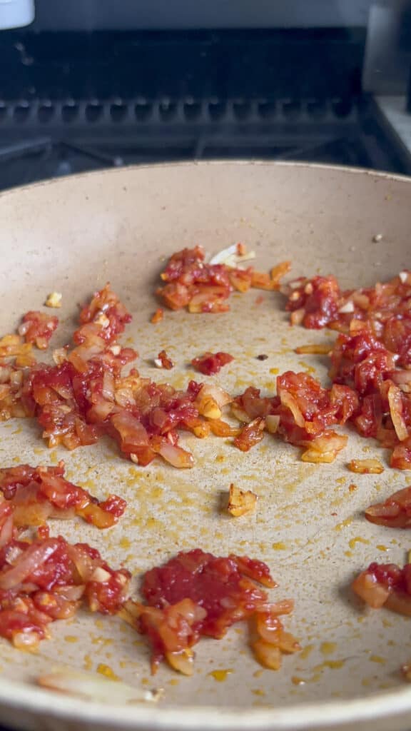 To start, heat your oil in a saucepan and add the minced garlic. Saute for a minute or two until it begins to turn golden and fragrant, then add the tomato puree and chipotle chilli paste. Cook for two minutes to allow the pastes to turn fragrant and deepen in colour.