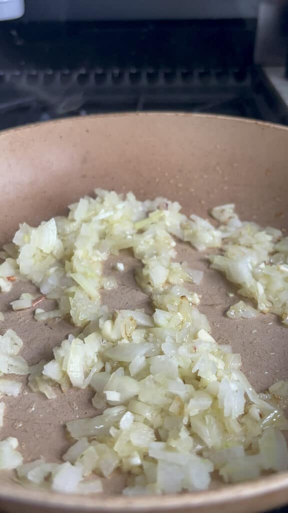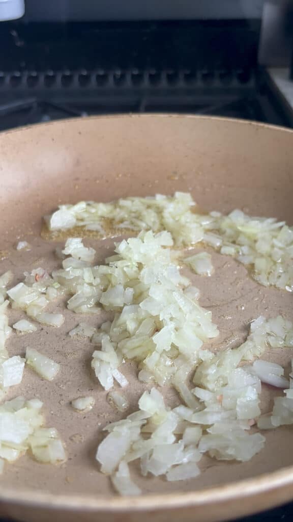 - Heat your oil in a pan on a medium heat and add the diced onion. Saute for 4-5 minutes then add your minced garlic. Saute for 1-2 minutes until golden and fragrant.1 small white onion, 1 tablespoon olive oil, 2 cloves garlic