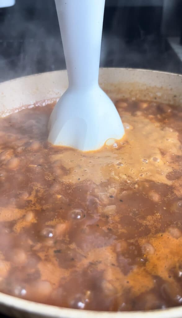 - Blend between ¼ and ⅓ of the pan with a stick blender (or remove, blend, and return to the pan).