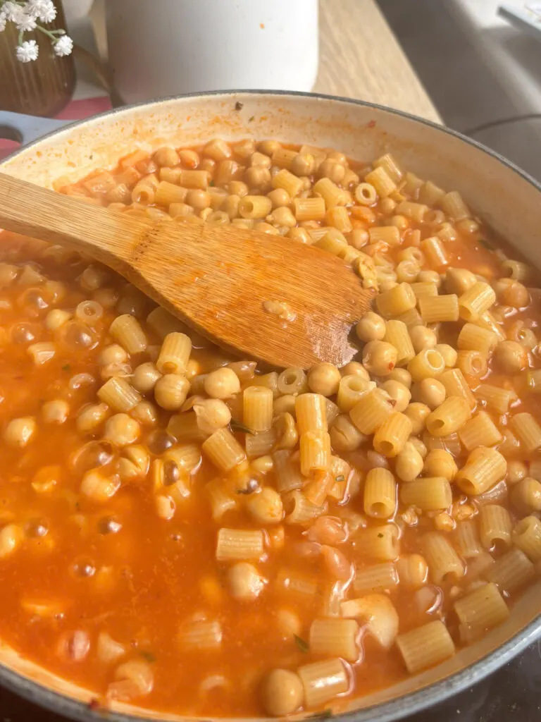 I love cooking this easy pasta e ceci recipe, as well as our favorite pasta e fagioli (pasta and beans), for my daughter and me. It’s great when you’re short on time but want a one-pot dish that feels both nourishing and comforting. It’s easy to adapt, too – this recipe is great with some red pepper flakes, but you can omit these and just add them to your own bowl to keep the recipe family-friendly.