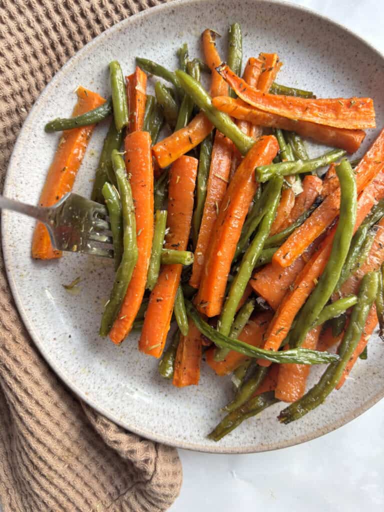 You could also mix up the green beans, carrots, and seasonings and then freeze in an airtight freezer bag to use at a later date. Simply add oil and roast from frozen for an extra 10 minutes or so.