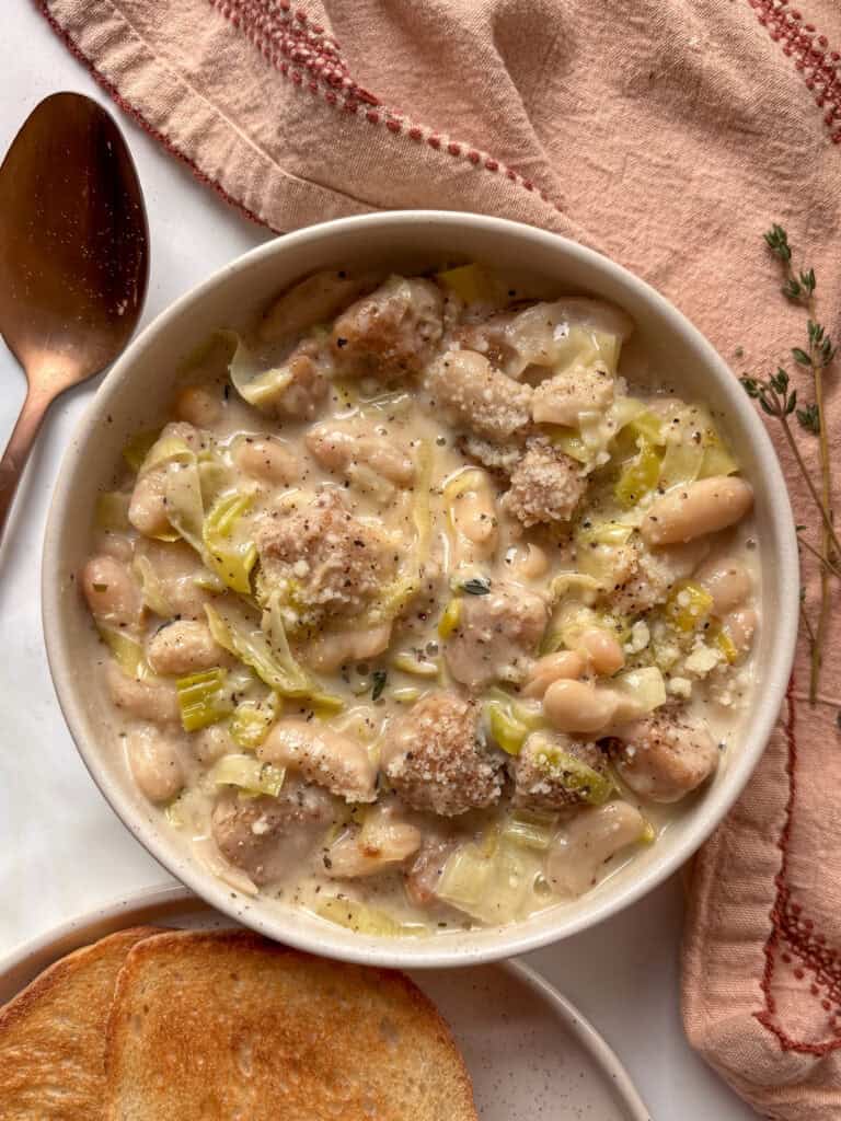 This creamy sausage and bean casserole is the perfect one-pot comfort food dinner. Vegetarian sausages are sliced and fried until crispy, then leeks and white beans are simmered in a gorgeously creamy white wine sauce with thyme.
