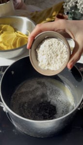 - Add the flour, stirring into the butter until a doughy consistency forms and it smells biscuity.2 tablespoon plain flour
