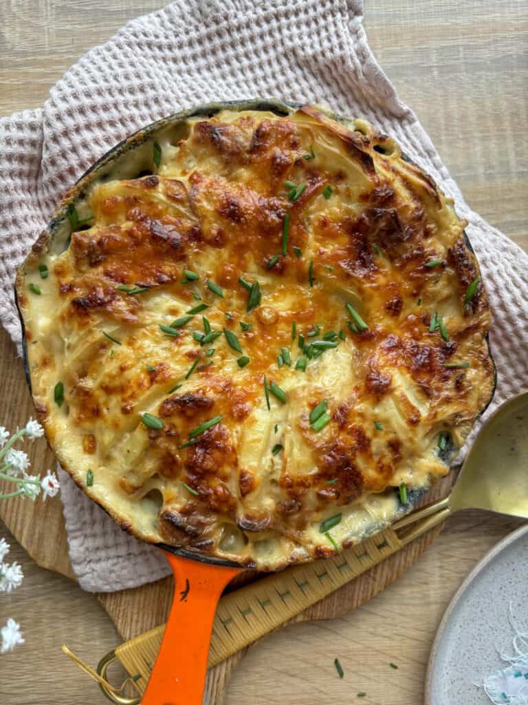If you would prefer to make this dish faster, you could skip the caramelized onions step (although they really do elevate this recipe!). Simply layer the raw onion amongst the potatoes before pouring over the sauce and they’ll baked at the same time as the potatoes. This will cut the cooking time by 30 minutes.