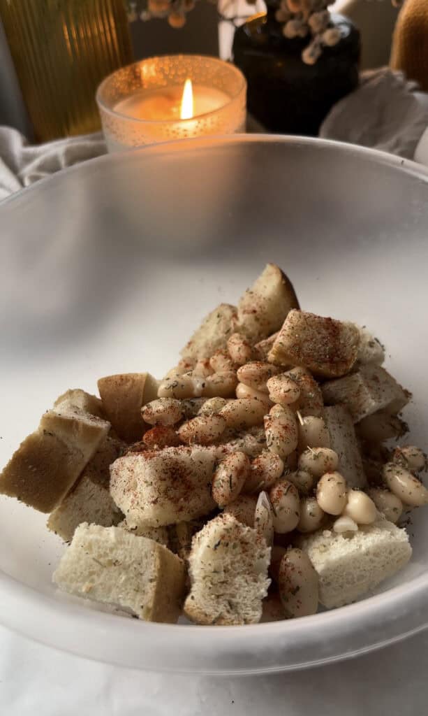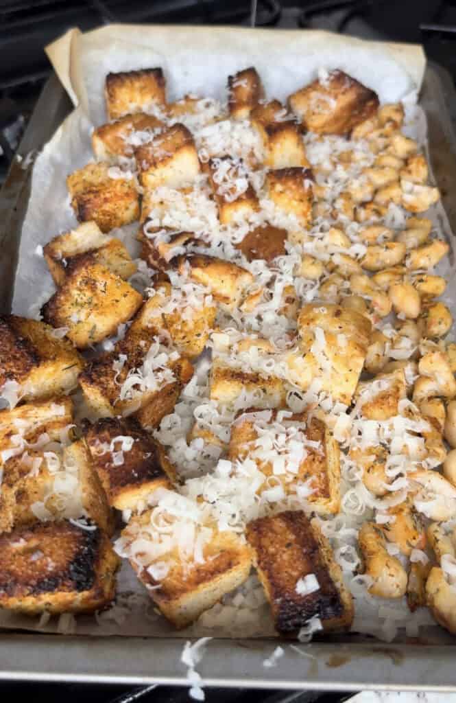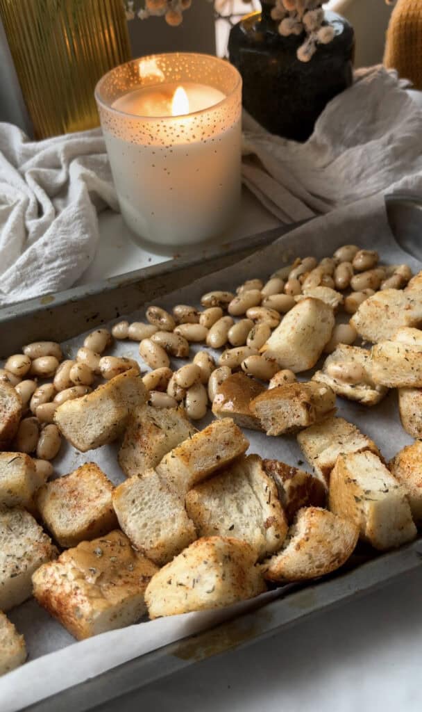Toss your cubed bread and the rest of the beans with olive oil and spices, then bake until crispy and golden. Add your hard cheese (I use Pecorino) about 5 minutes before removing the tray from the oven so it gets nice and melty.