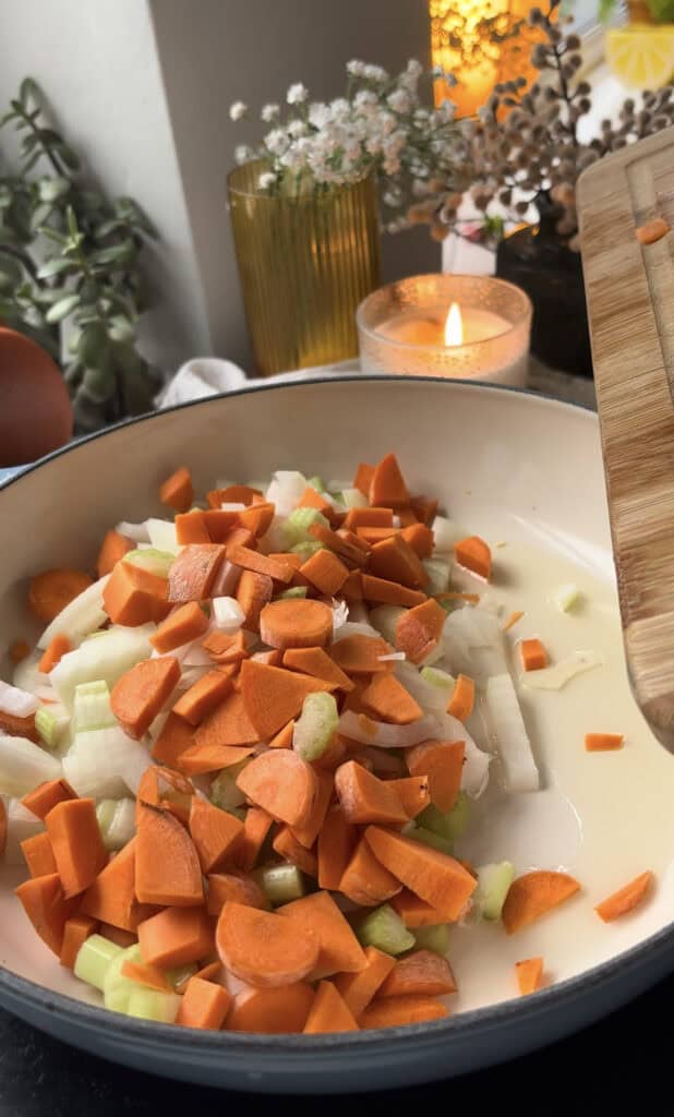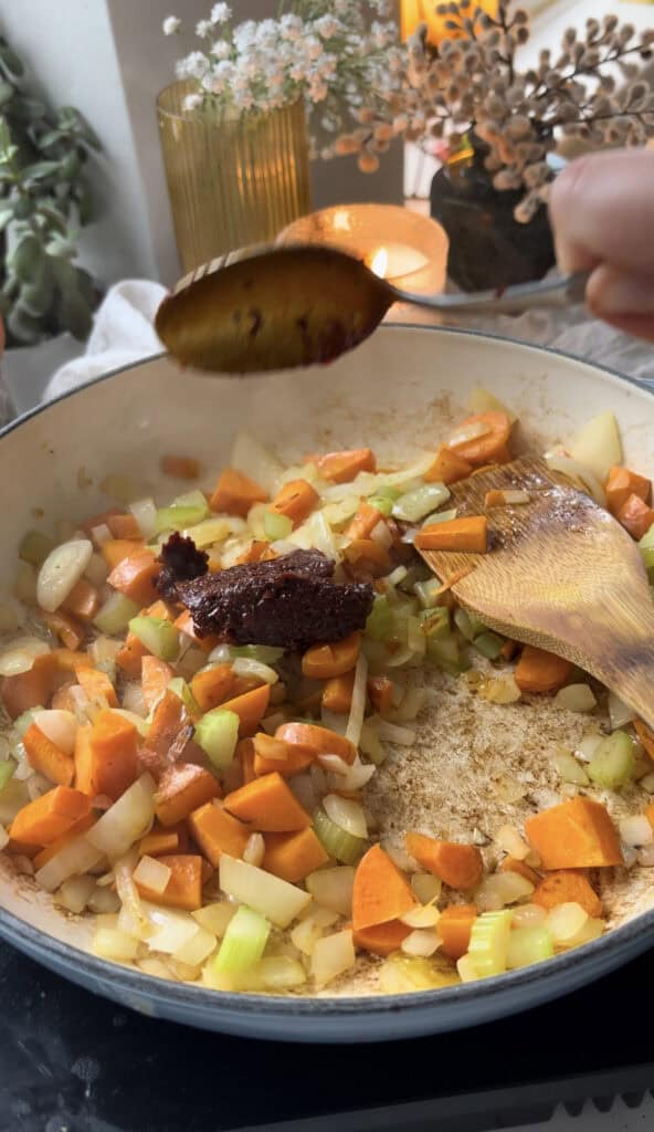 - While the peppers cool, heat the remaining olive oil in a large pan and add the onion, celery, and carrot. Saute for 7-8 minutes until they begin to soften. Add the harissa paste and stir it into the vegetables for another minute.