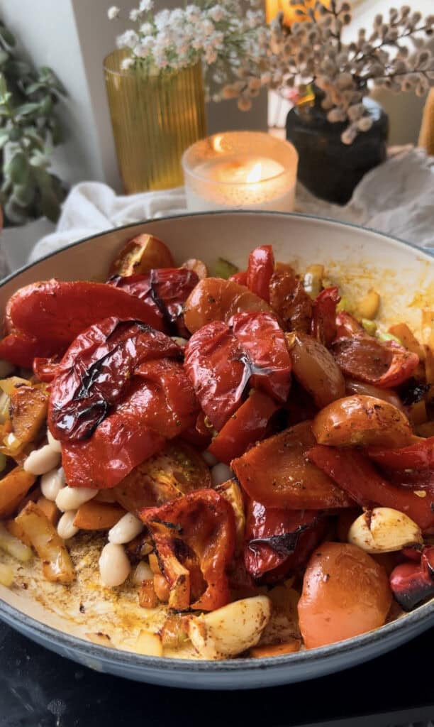 Sprinkle over your oil, smoked paprika, and oregano, and roast the red peppers, tomatoes, and garlic with until they're soft and slightly charred.