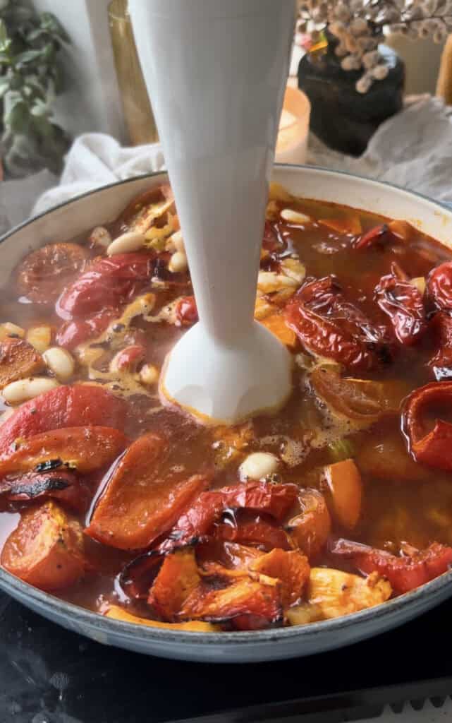 - Add the peppers, tomatoes, and garlic to the pan along with the vegetable stock. Add half the can of drained beans. Blend everything until smooth and creamy, then simmer on low heat. Season to taste.