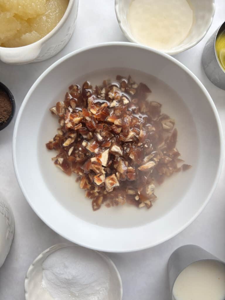 - Dates & water: Finally, the addition of dates gives this vegan applesauce cake an amazing texture, flavor, and natural sweetness. Use pitted deglet nour dates chopped up as small as you can, if possible.