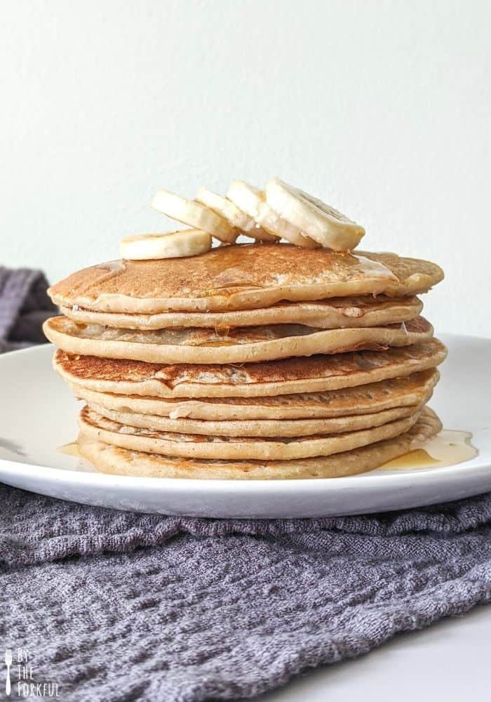 These super easy vegan banana pancakes are fluffy, light, and make a delicious breakfast. This one-bowl recipe is so quick and perfect topped with more banana and lashings of maple syrup.