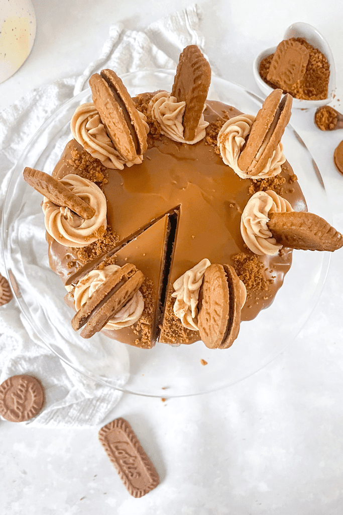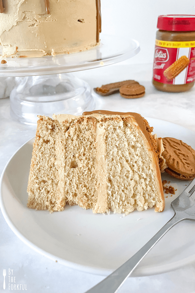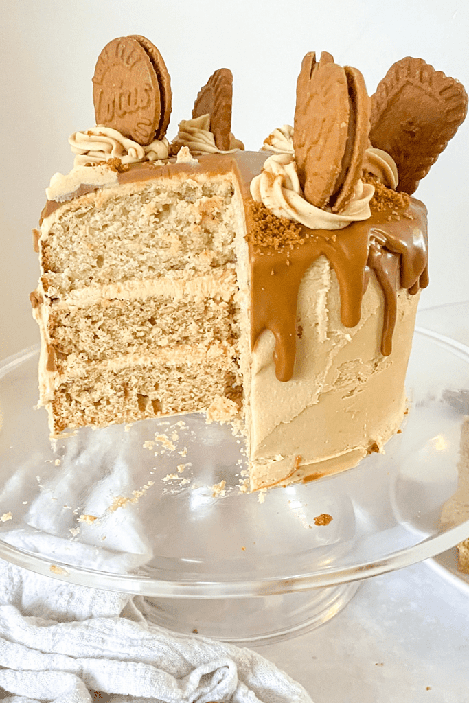 This recipe makes a three-layer vegan biscoff cake with a light, fluffy sponge and an indulgently cream vegan biscoff buttercream.