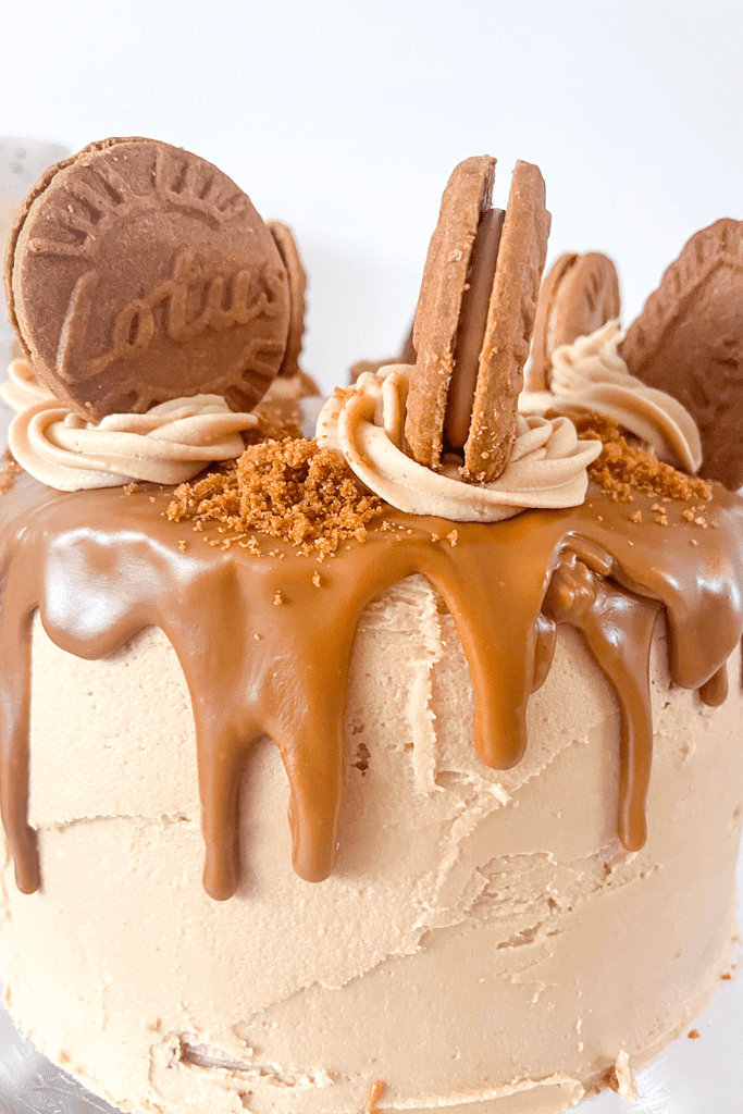 - Melt 20g of biscoff spread until just soft (not too hot), and slowly pour it over the top of the cake bit by bit, encouraging the spread to drip down the sides.