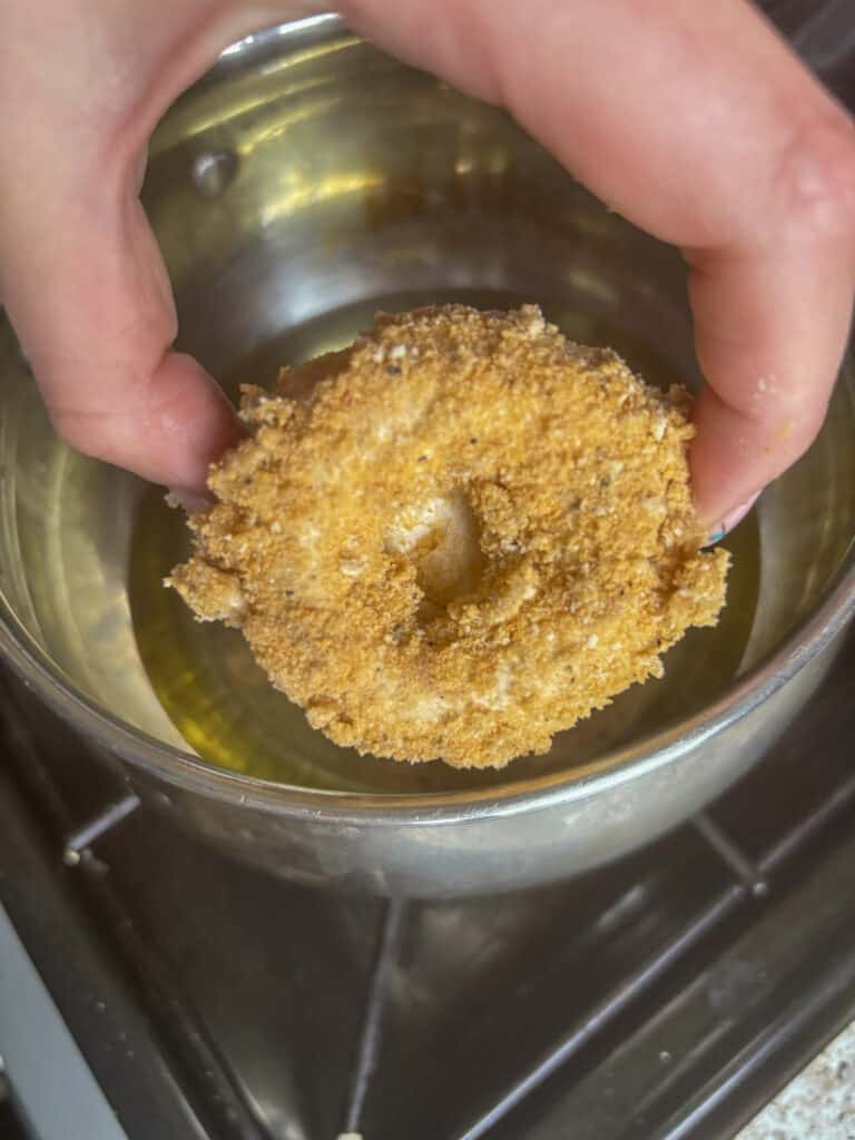 - Carefully lower your breaded mushrooms into the pan (I used a pan small enough to do 3 safely at a time).