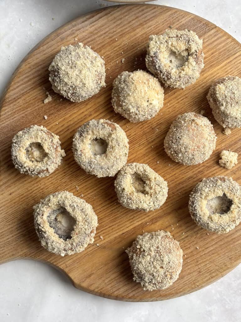 Assemble your three bowls - one with the cornflour, one with your breadcrumbs and listed seasonings, and one with the plant-based batter mixed together. It's also helpful to have a chopping board or plate ready to place each mushroom once breaded (but prior to frying).