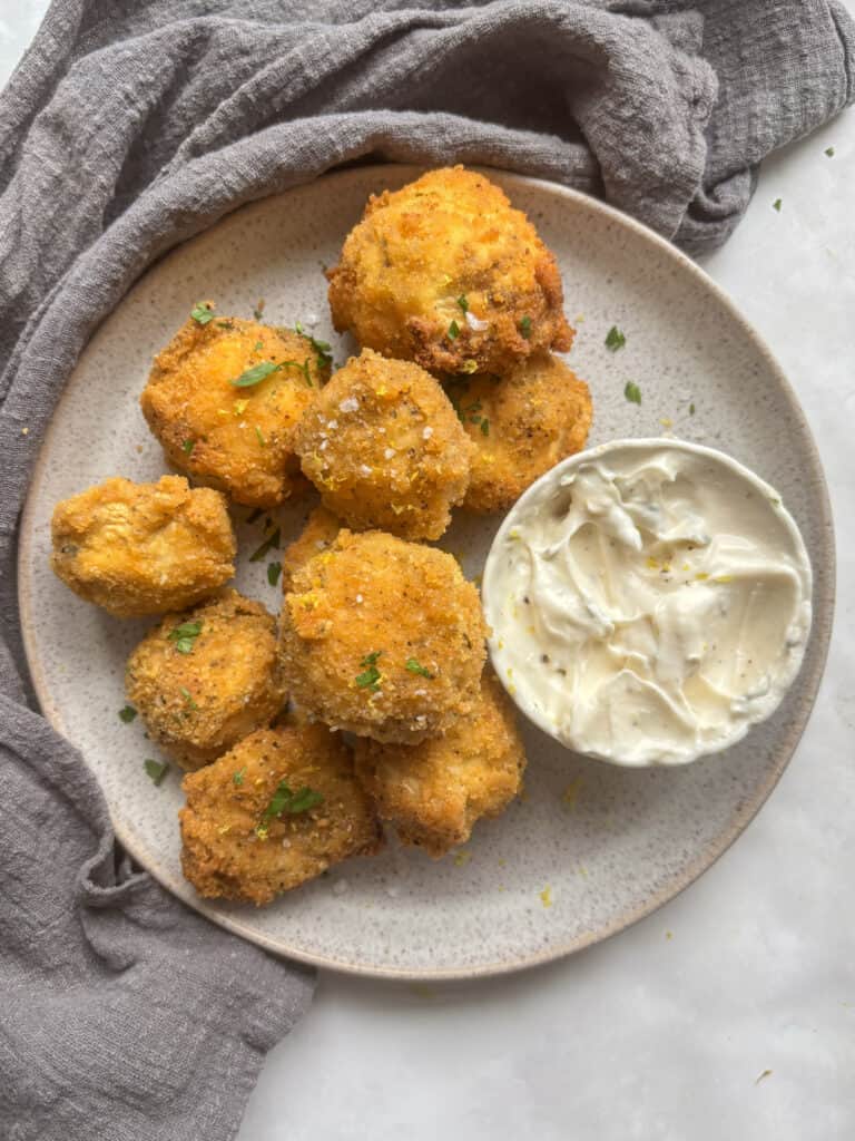 - Vegan garlic dip: A mix of vegan mayo, minced garlic, lemon juice, and chopped fresh parsley goes amazingly with this recipe and really takes your breaded mushrooms up a notch! You could also opt for a tomato salsa if you prefer.