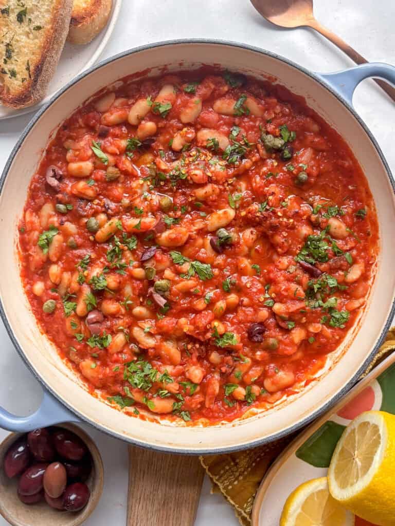 Puttanesca relies on simple but punchy ingredients like salty olives and briny capers to bring big flavor to the dish without the need for hours of simmering - and this bean-based version of the dish uses those same flavors but swaps out the pasta for white beans for a lower-carb alternative.